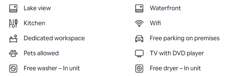 Note that guests will not have access to a full size boat during their stay (paddle boat and kayaks are available). Guests are welcome to bring their own boat for personal use on the lake. Feel free to contact the hosts if you have any questions before or during your stay.