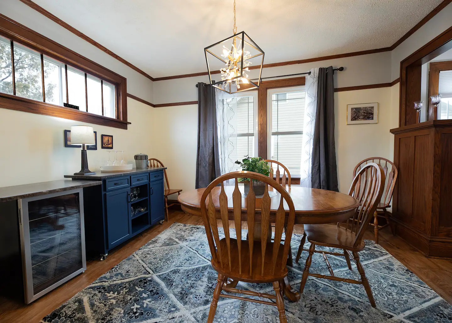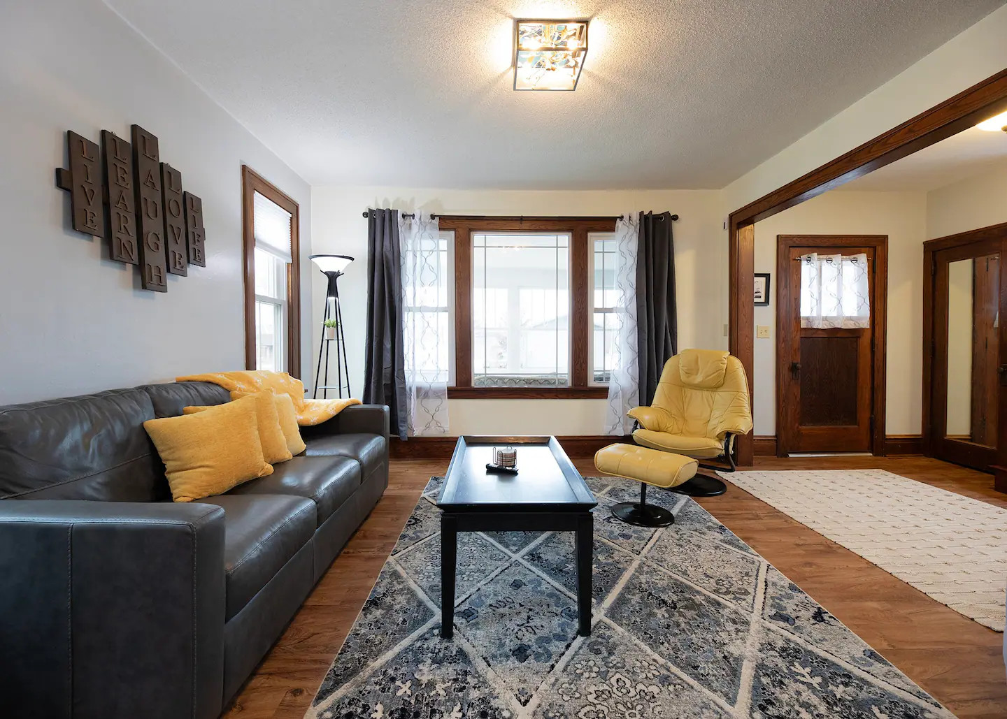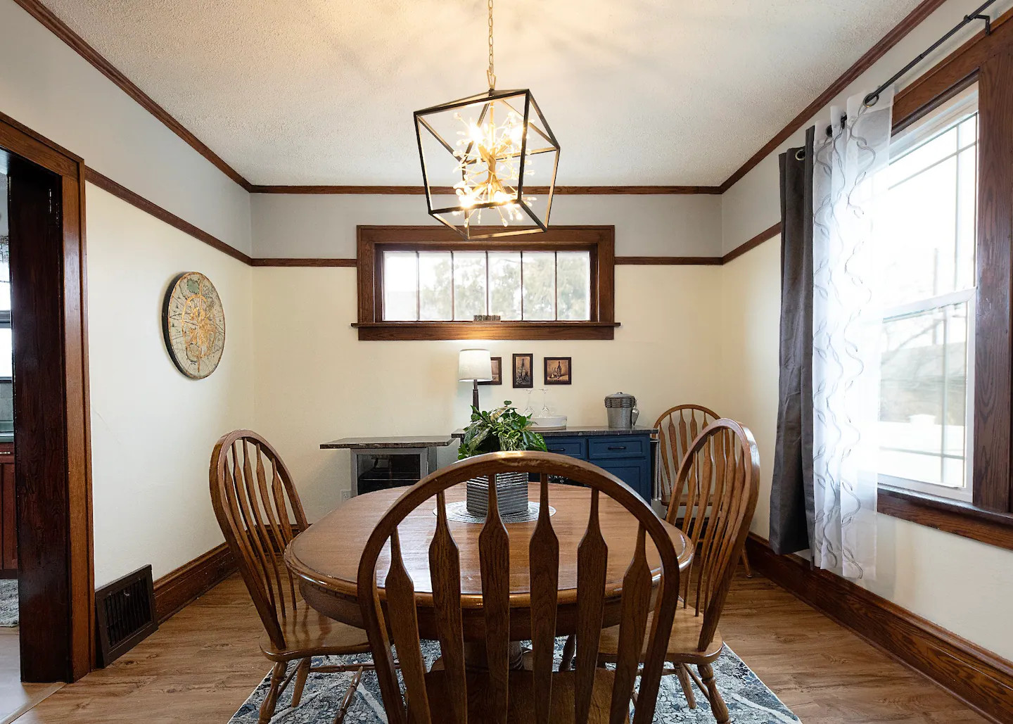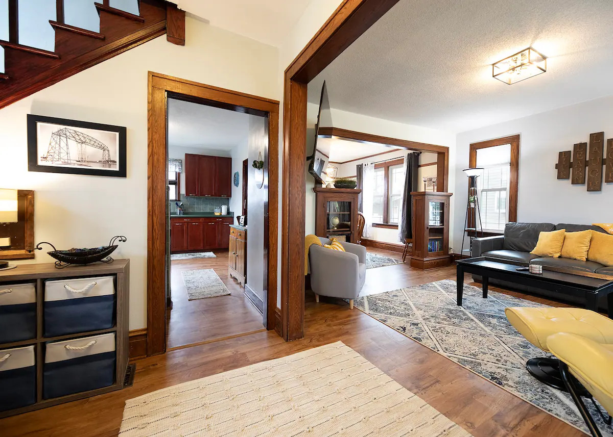 The house has 3 floors, with each floor offering its own uniqueness. The main floor has a dining room + kitchen with fully stocked kitchen appliances. The living room offers its own cozy feel where you can relax and watch your favorite movies/programs on the 65 inch smart TV. You can also step outside to the fully furnished sunroom to read, relax and enjoy coffee and cold drinks.