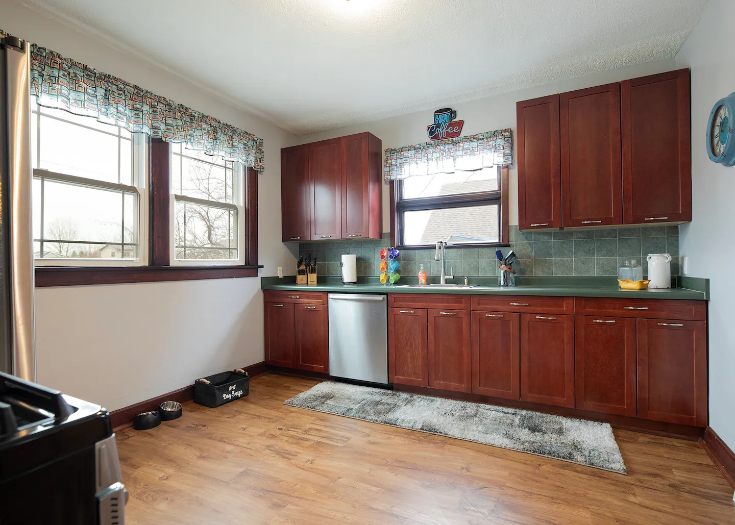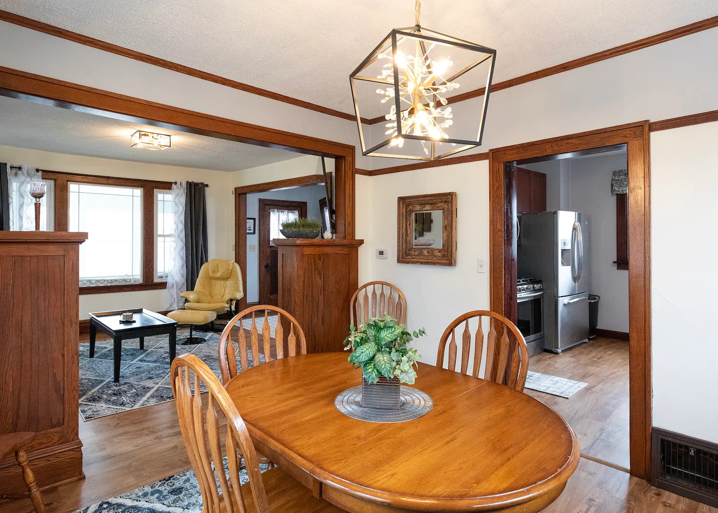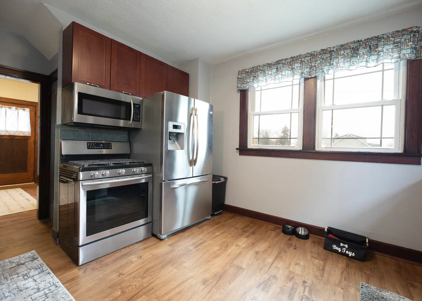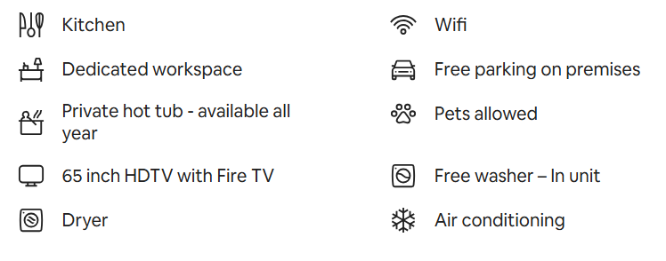 The house has 3 floors, with each floor offering its own uniqueness. The main floor has a dining room + kitchen with fully stocked kitchen appliances. The living room offers its own cozy feel where you can relax and watch your favorite movies/programs on the 65 inch smart TV. You can also step outside to the fully furnished sunroom to read, relax and enjoy coffee and cold drinks.