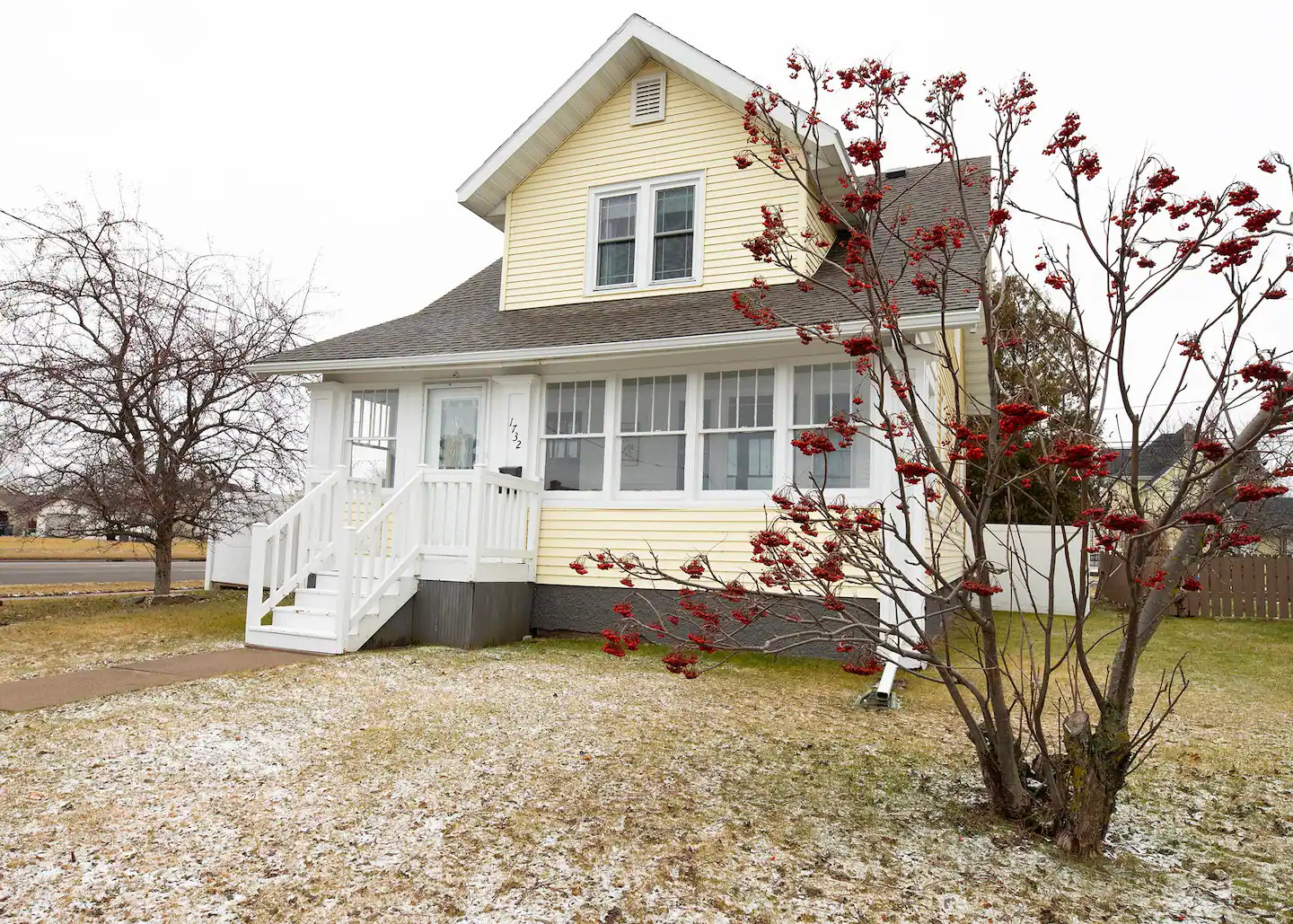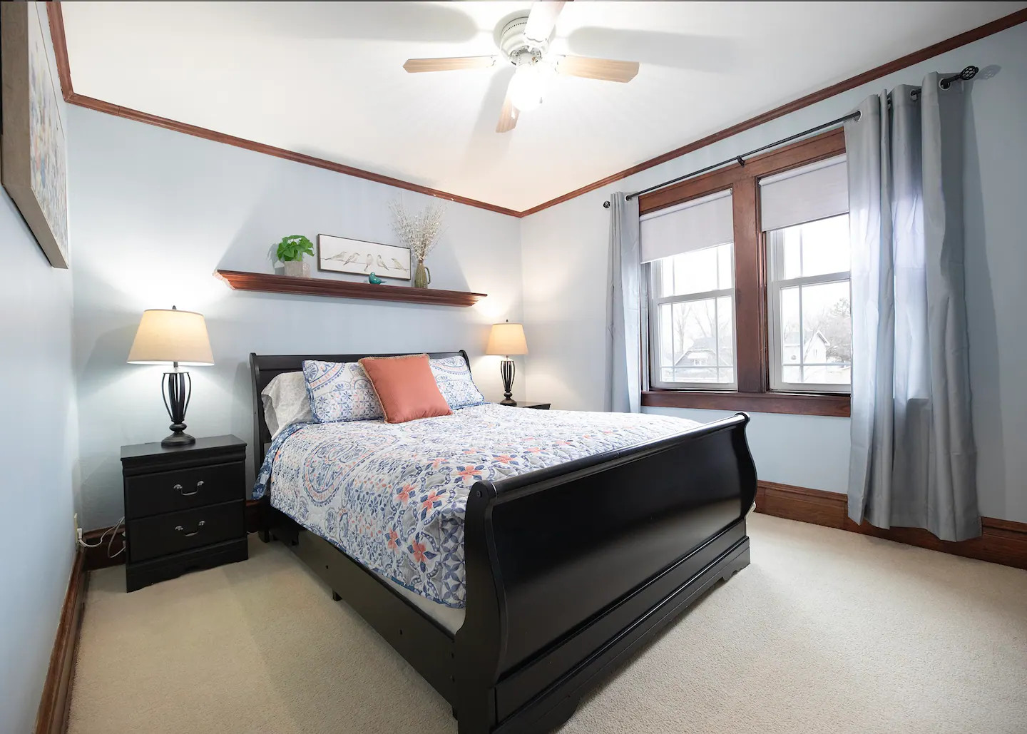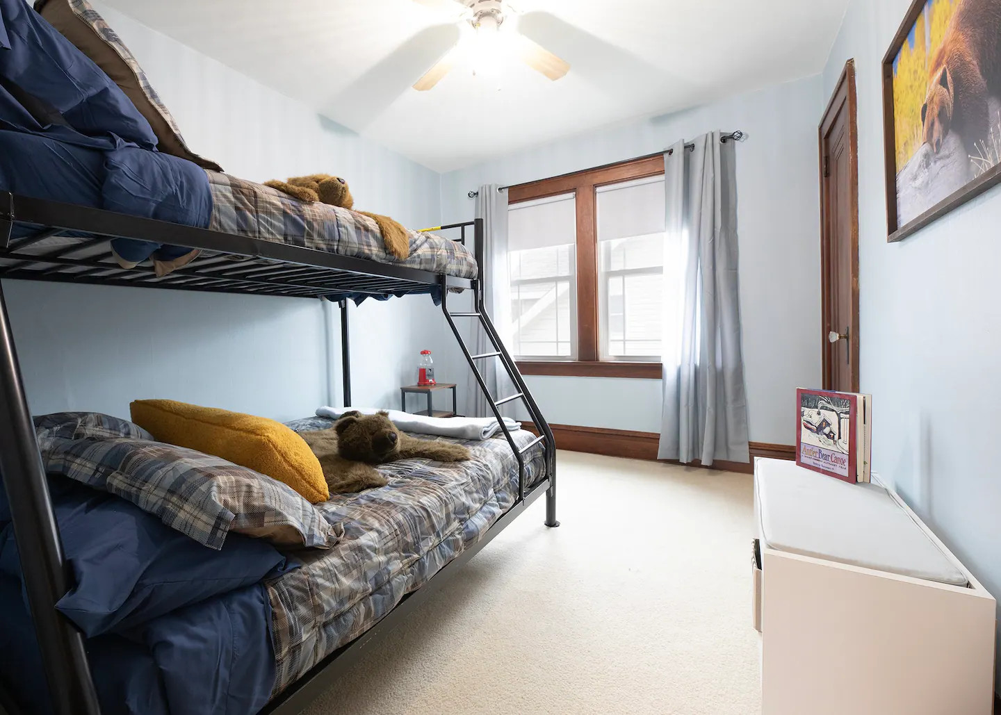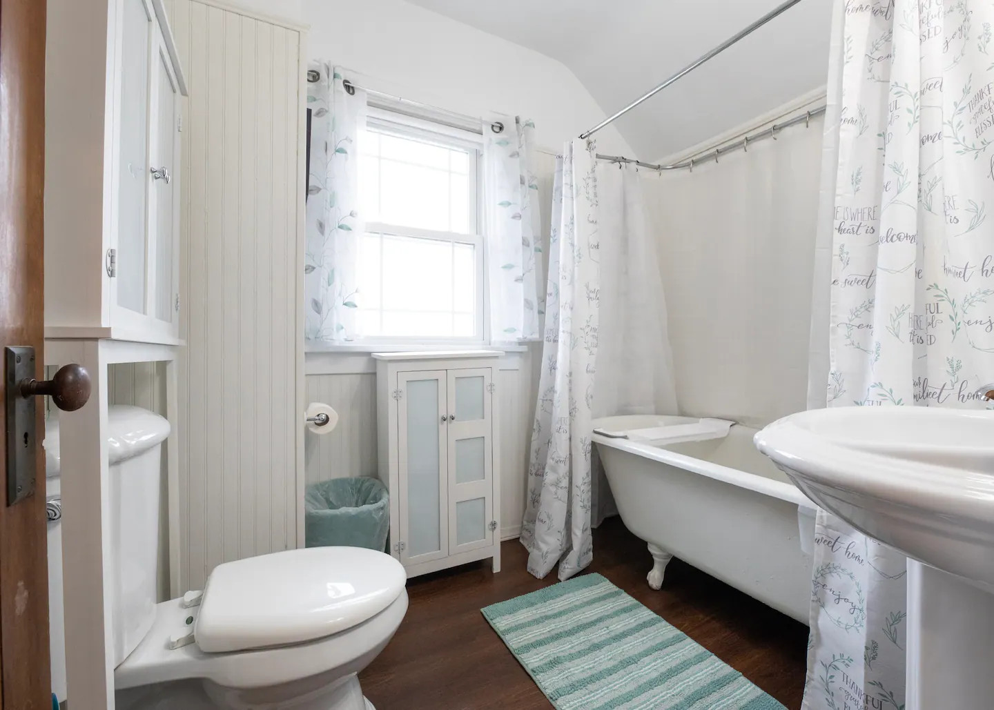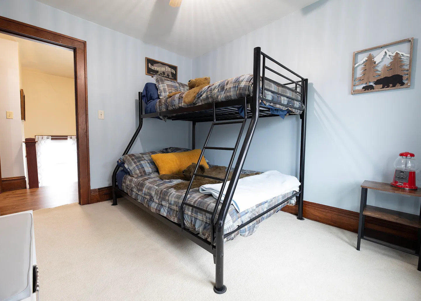 The upper level has three bedrooms, with a queen bed in each of the first two rooms and bunk beds (singles over a queen bed) in the third bedroom. The full-size bathroom comes with a classic clawfoot tub!
