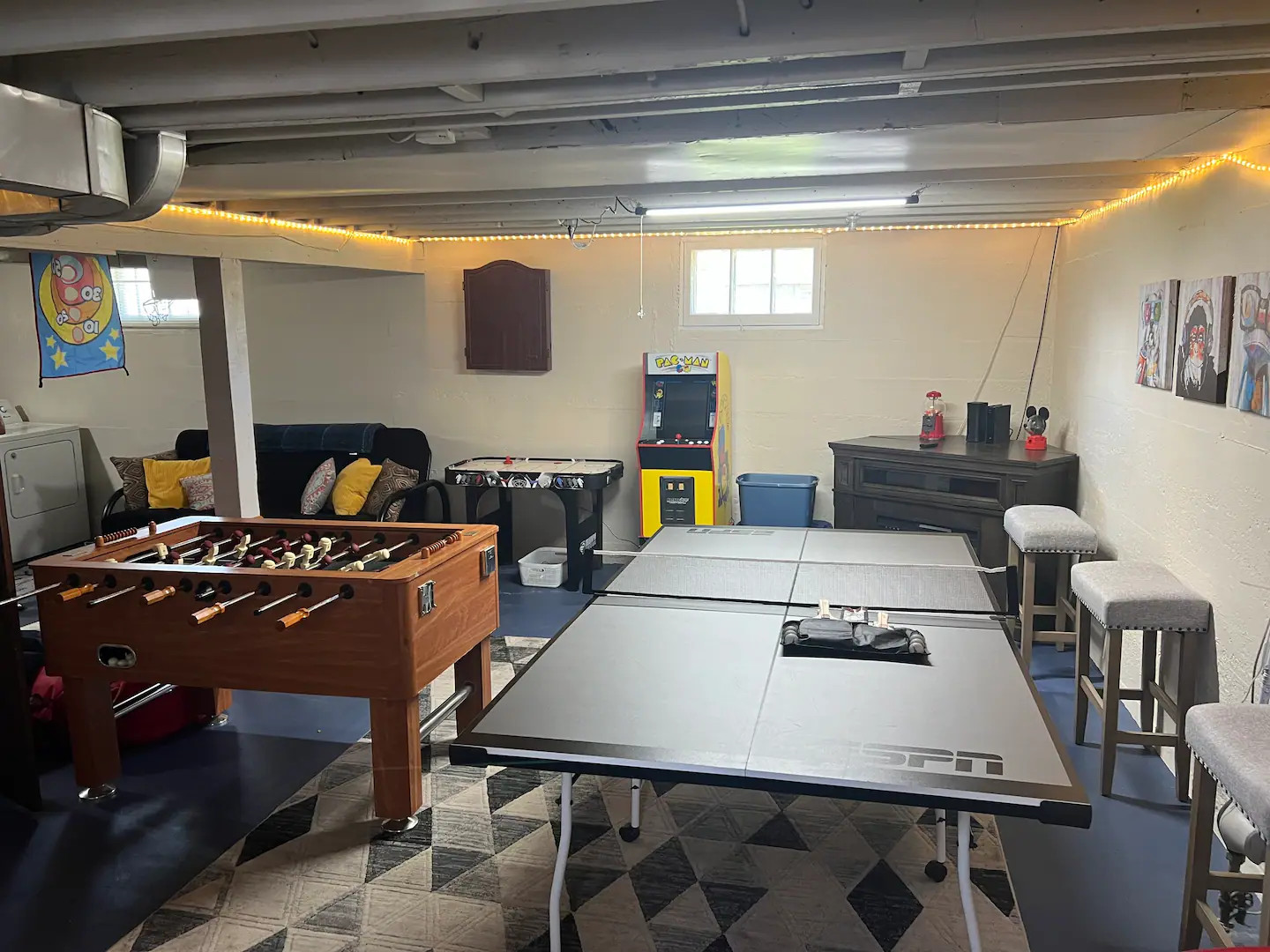On the lower level, you'll find a full-size game room, which includes a futon and an electric fireplace for relaxing. A half bath, washer and dryer are also located on this level.